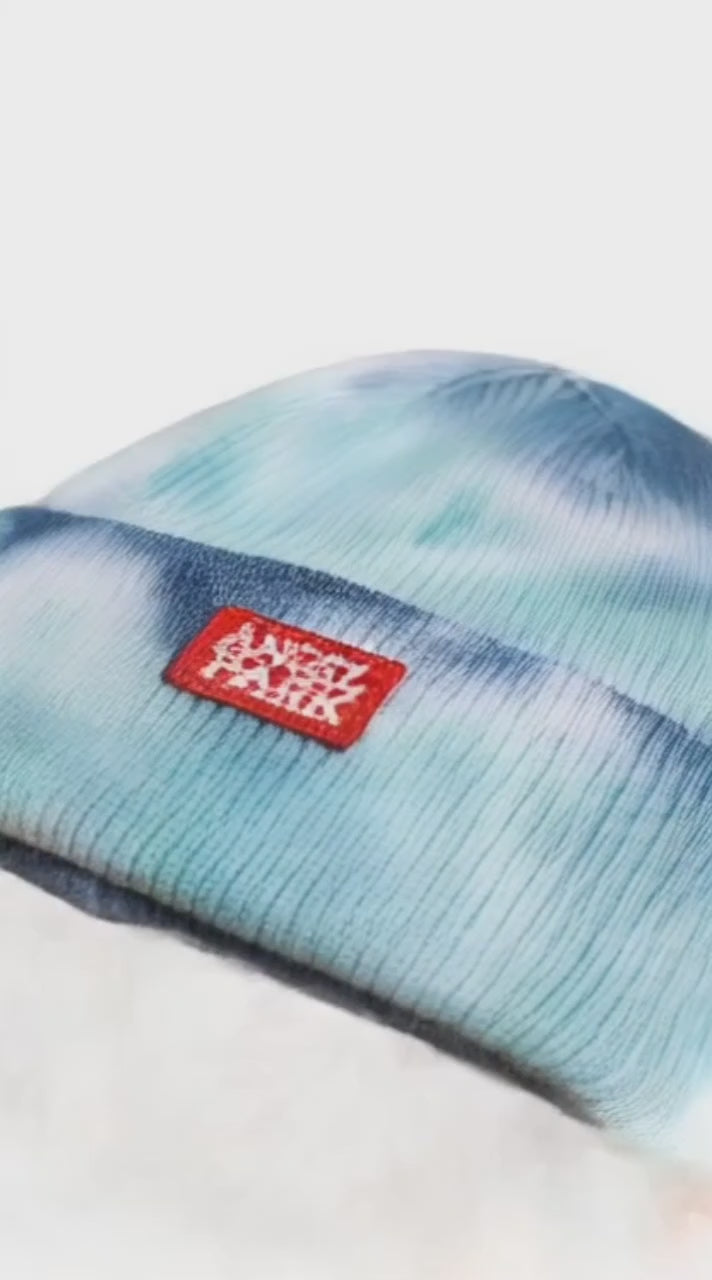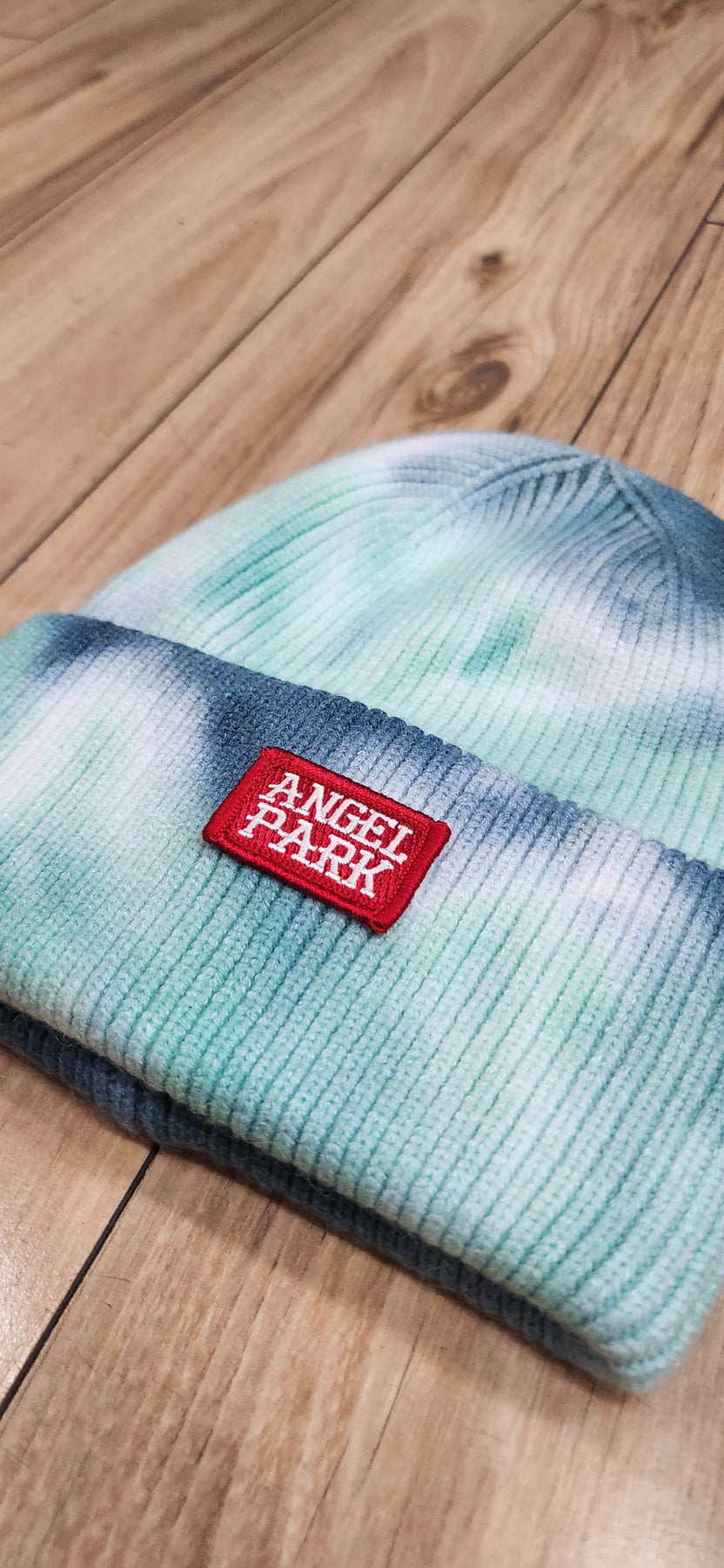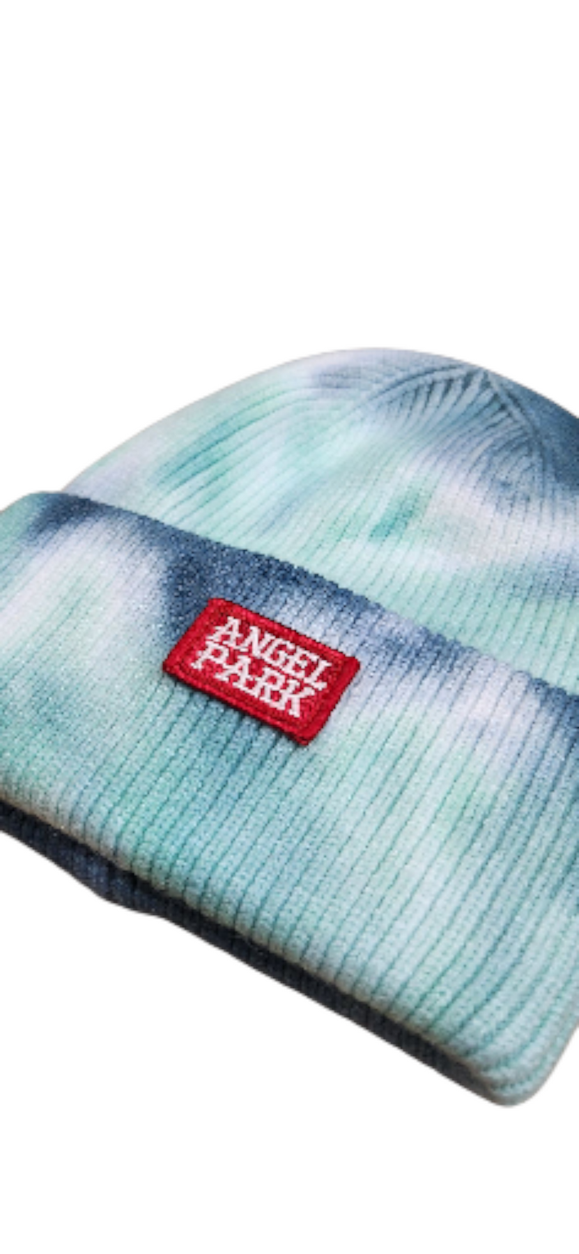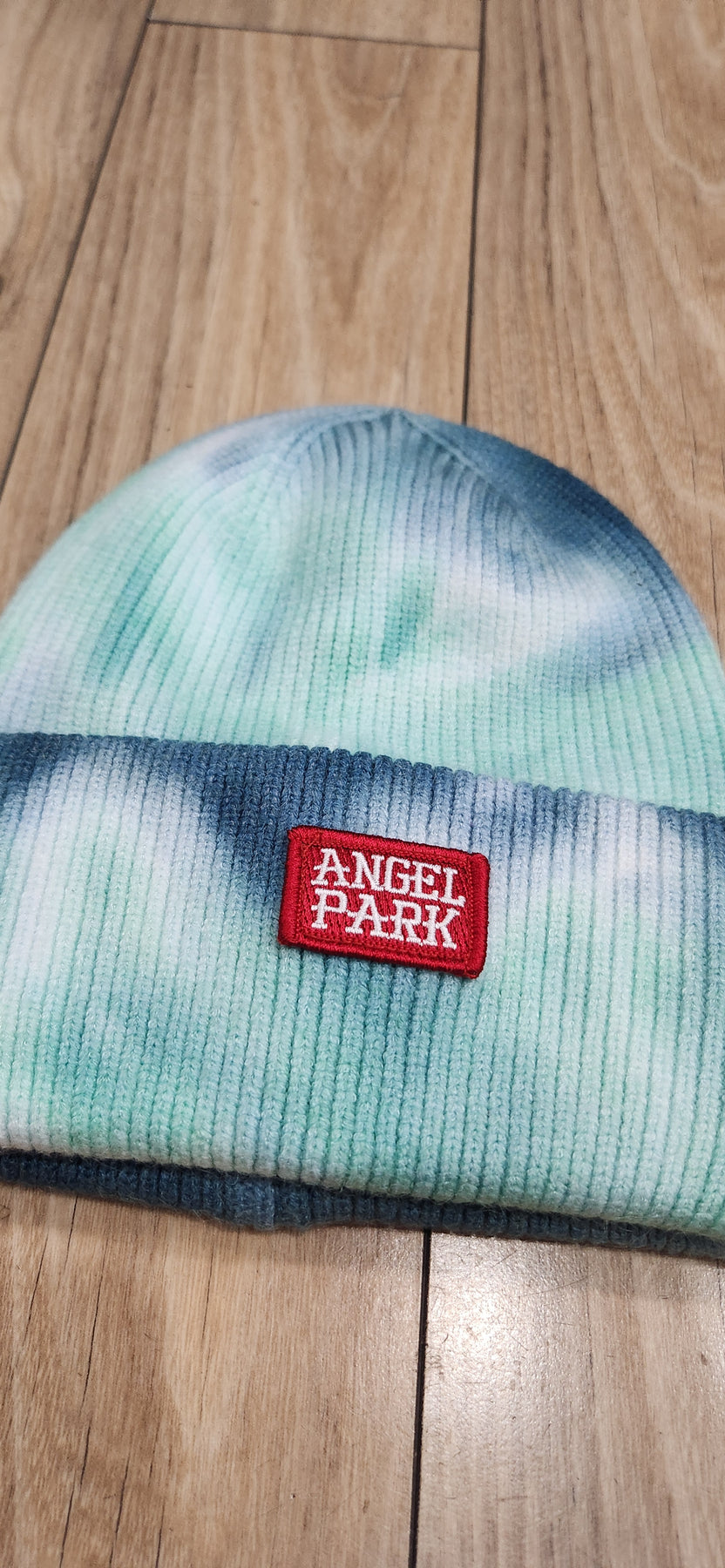 Fitted Tie Dye blue mix Cotton Beanie hat with red Angel Park logo.